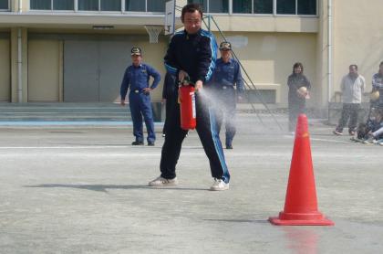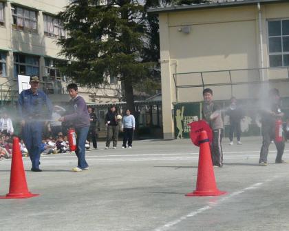 避難訓練後、先生の代表と6年生の代表が消火器を使って、消火訓練を行ないました。先生も6年生も真剣に消火訓練を行ないました。