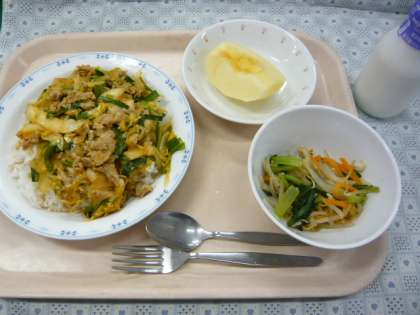 ビタミンB1は、今日の豚キムチ丼にも入っている、にんにくやにら、たまねぎと組み合わせて食べると、体にたくさん吸収されます。今日も、残さずに食べてくれるとうれしいです。