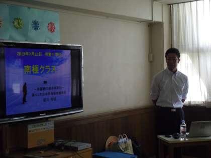 スマイルスクール 南極クラス 公開日 2013/07/22 更新日 2013/07/22 今日のできごと スマイルスクールで南極クラスが行われました。4・5・6年生32名が参加しました。実際に第53次日本南極地域観測隊越冬隊で南極まで行かれた堀川秀昭さんからお話を聞いたり、クイズを出してもらったり、南極の氷の融ける音を聞いたりしました。 子供たちは、目を輝かせて参加していました。