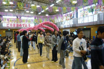 6年生を送る会を3,4校時に体育館で行いました。今日のために準備した背景や卒業おめでとうの花文字、天井の輪飾りなどの心づくしの装飾と、心のこもった各学年の出し物が披露されました。