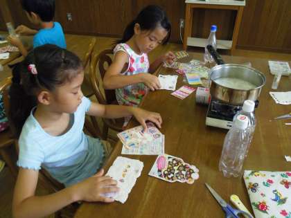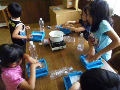 今日は、1・2年生が牛乳パックから紙を作るリサイクルに挑戦しました。小さくちぎった牛乳パックをペットボトルに入れて振り、型に入れ、ホットプレートで乾かしたら、紙の出来上がりです。子供たちは最後に、それぞれ持ってきたシールやスパンコールで飾り付けをするなど、どの活動も楽しそうな笑顔でいっぱいでした。教えて下さったベネッセの方、お手伝いの保護者の皆様、本当にありがとうございました。