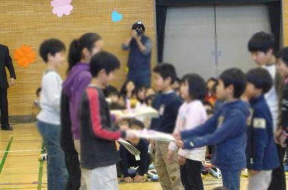 記念品して、全校みんなの手作りのカレンダーを1年生が代表して手渡しました。
