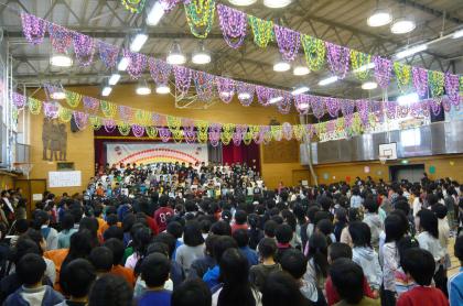 次に在校生みんなで「きみとぼくのラララ」を心を込めて歌いました。最後に「校歌」を歌いました。修了式には6年生は出席しないので、1年生から6年生全員がそろって歌えるのが最後になりますので、特別な思いで歌いました。