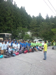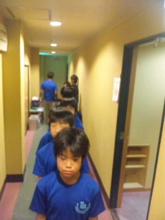 「風和里」に着きました。開園式でお世話になる旅館の方にしっかりと挨拶をしました。入室後に地震や火災に備えて、全員で避難訓練を行い、非常口の確認をしました。