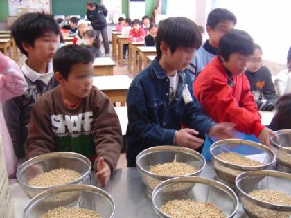 明日(6日)農業大学で味噌作りの実習をする4年生が、農大の古庄先生の指導で、味噌を仕込む前の準備をしました。大豆をていねいに洗って、水につけておくのです。大豆はゆでる前に一晩しっかりと水を含ませてからでないと茹で上がりません。子どもたちも、明日の実習を楽しみにしています。当日は農大の学生さんが、朝早くから大豆を茹でてくださるそうです。ありがとうございます。