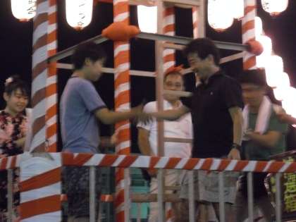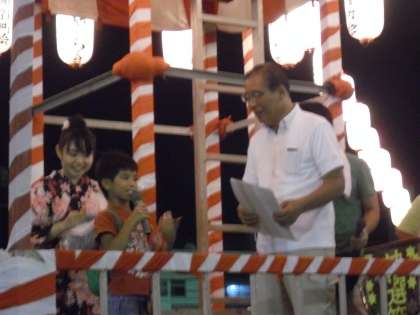 盆踊りの途中から雨が降り始め、予定を早めてお待ちかねの抽選会をしました。5等、4等と進み、残すところは1等のみ。賞品は自転車です。やぐらの会の和田会長がくじを引きました。注目の当選者は何と現役の用賀小学校の小学生でした。今年のやぐらの会も大人も子供も大勢が集い、交わり、笑顔があふれるすてきなお祭りでした。和田会長をはじめ、やぐらの会、おや児の会、PTAや地域の皆様、先生方、大変おつかれさまでした。ありがとうございました。