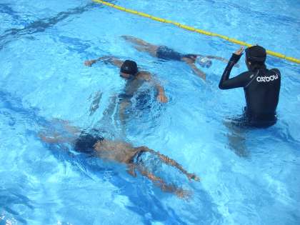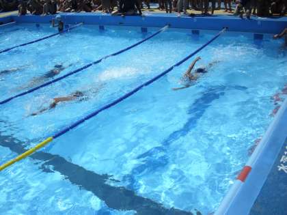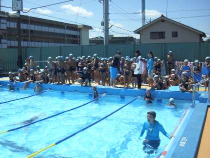 今年の夏の水泳教室も今日を入れてあと2日。今日は検定です。この夏の練習の成果を試す絶好の機会で、たくさんの児童が参加をし、検定を受けました。(写真は中学年)どの児童も自分が目標にしている泳ぎを一生懸命泳いでいました。用賀小学校の夏季水泳教室の検定では、多くの教員が一人一人に適切な声をかけ、指導をしながら行います。吹く風は秋めいてきましたが、プールは必死になって泳ぐ児童と熱い声かけをする教員とで活気にあふれています。児童の皆さん、よく頑張りました。明日のプールも参加をしましょう。
