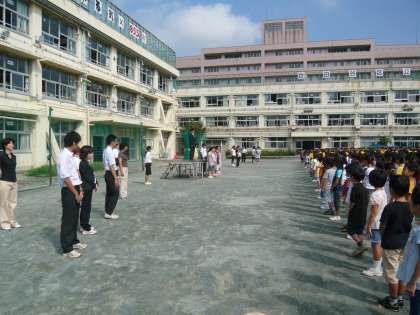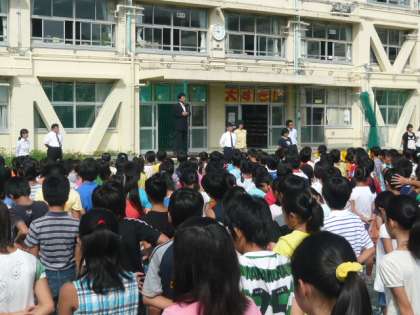 昨日の寒さとはうって変わって、30度を超す暑さの中で始業式が行われました。体が慣れていないせいか、気分の悪くなる子どももいましたが、日に焼けた顔がまぶしいほど輝いていました。