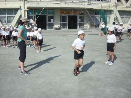 今日の体育朝会のめあてはクラスで立てた目標の実現です。それは単にとんだ回数を多くするだけではなく、担任と子供たちが1つになり、心を合わせて取り組むことでもあります。この大なわとびでは体力作りとともにクラスの団結や子供たちの心の育ちを大切にしています。