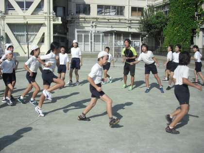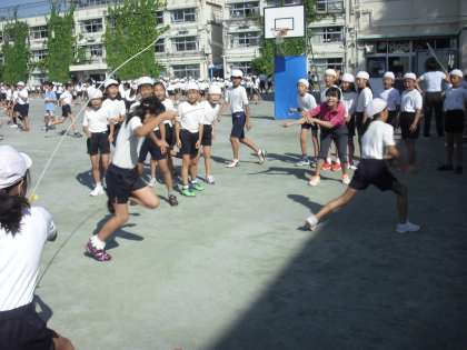 雨で1日延びた体育朝会が晴天のもと行われました。今日はクラスごとの大なわとびです。用賀小学校ではどの学年でも共遊びなどを通して大なわとびによく取り組んでいます。特に6年生は来月行われる連合運動会に向けて、今練習に熱が入っています。