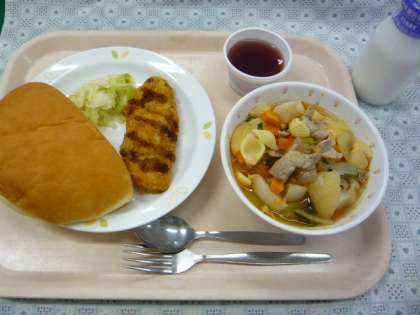 今日は、自分でパンに魚フライをはさんでたべるセルフフィッシュサンドも出ています。上手にはさんで、残さず食べましょう。