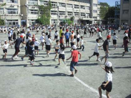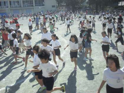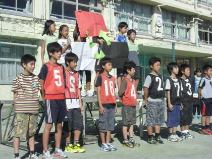 全校が3つに分かれての鬼ごっこは迫力満点。スタートの合図で子供たちが一斉に走り出し、他の色の子をつかまえます。さわやかな秋空の下、全校で楽しく体を動かし、遊ぶことができました。集会委員の進行も分かりやすく、とても上手でした。