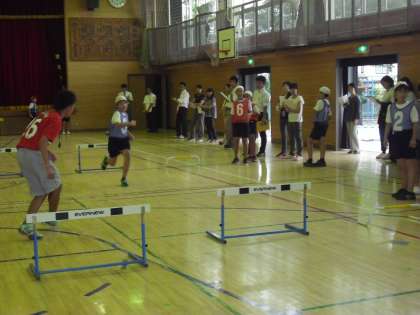 本校では「確かな学力を育む教師の授業力の向上」を主題に校内研究に取り組んでいます。今日は6年生の提案授業で、6年の担任4人で指導案を作成し、2組の諸星先生が体育の「ハードル走」の研究授業を行いました。