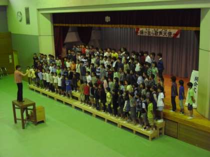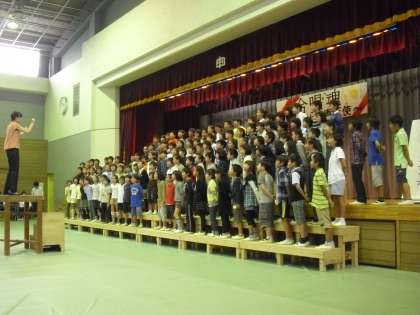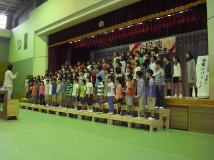 子供たちは中学生など多くの方が見守る中、緊張感をもちながらも5年生らしく全身でリズムに乗って元気のいい歌声を体育館に響き渡らせました。