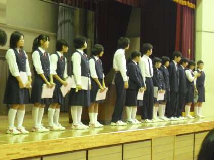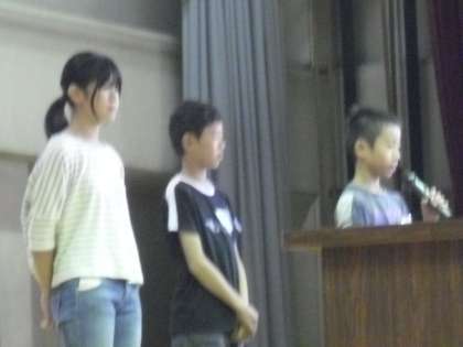 用賀小からは3名の代表児童が用賀中の全校生徒の前で来月行われる展覧会のPRをしました。3名の子供たちはたいへん緊張していましたが、用賀小として今取り組んでいることを立派に述べることができました。