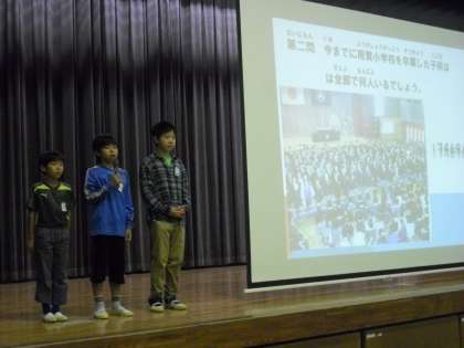 開校記念集会が体育館で行われました。前期の計画・代表委員の子供たちが企画・準備をし、この日を迎えました。