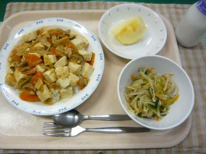 11/25 本日の給食 公開日 2013/10/25 更新日 2013/10/25 給食 〜今日の献立〜 家常豆腐丼 牛乳 塩ナムル くだもの(りんご) 〜給食メモ〜 今日の給食は、中国料理の「家常豆腐丼」です。そこでクイズです。「家常豆腐」とは、どういう意味でしょうか? 1.辛い豆腐料理 2.家庭でよく作る豆腐料理 3.作るのが難しい豆腐料理 家常豆腐には、栄養たっぷりの豆腐や、にんじん、ねぎ、たけのこなどの野菜がたくさん入っています。残さず食べましょう。 食材がとれたところ・・・ 閉じる 米…埼玉県 豚肉…群馬県 にんにく…青森県 しょうが…高知県 にんじん…北海道 長ねぎ…新潟県 もやし…群馬県 こまつな…東京都(江戸川区) りんご…長野県 クイズのこたえは、2の「家庭でよく作る豆腐料理」です。