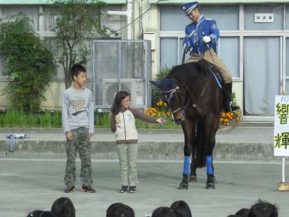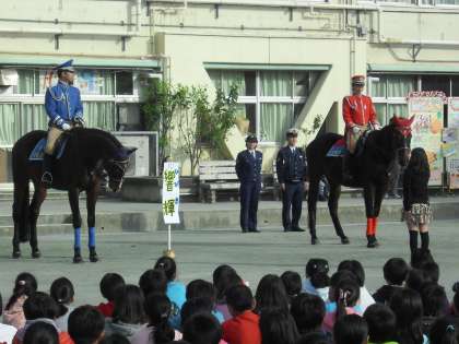用賀小学校の子供たちは毎朝玉川警察署馬事公苑騎馬隊のお馬さんと隊員の方に見守られながら登校しています。今日は1年に1度お馬さんに感謝の気持ちを伝える集会の日です。学校には「響輝」号と「翔馬」号の2頭のお馬さんが来てくれました。集会委員会の子供たちがこの日のために様々な企画を準備し、集会でお馬さんへの感謝を伝えました。また、各学級でもお馬さんに感謝するメッセージカードを作りました。