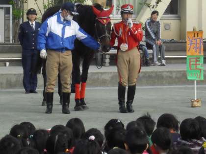 用賀小学校では昭和41年からお馬さんに見守られていますので、子供たちにとってこのことは日常のことになっていますが、実はとても幸せなことなのです。こうした中で子供たちの交通安全に対する意識が育まれています。