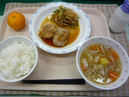 11月8日は、「いい歯の日」です。そこで今日の給食には、かみごたえのある「豆腐入りさくさくつくね」や「かみかみサラダ」を出しました。クイズです。一口、何回かむとよいと言われているでしょうか?