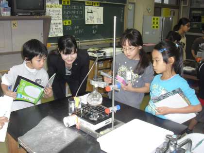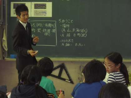瀧本先生の授業では、子供たちは器具を使った実験をし、関心をもって水蒸気について調べていました。名鏡先生の授業では、子供たちは写真資料を読み取り、流れる水の働きについての問題意識を高めていました。