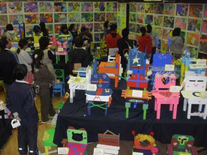 11/14 明日は展覧会 公開日 2013/11/14 更新日 2013/11/14 展覧会 明日の展覧会を前に教員で互いに作品を鑑賞し合いながら研修を行いました。それぞれの作品の担当教員が作品作りの工夫や苦労、見所や子供たちの制作の様子などを説明すると、他の教員からは驚きや称賛の声が聞かれ、とても有意義な時間でした。 明日は児童鑑賞日。子供たちは鑑賞をとても楽しみにしています。そして、午後3時からは保護者鑑賞の時間です。お時間のある方はどうぞご来校ください。