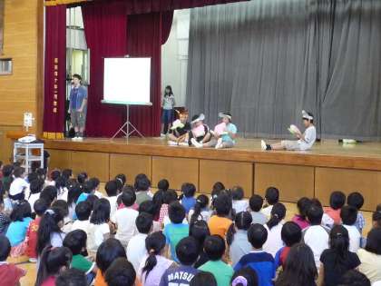 今日の委員会発表は図書委員会のお話劇です。「にゃーご」のお話を、ナレーターの語りと舞台劇で見せてくれました。とっても上手だったのできっとたくさん練習したんだなと思いました。