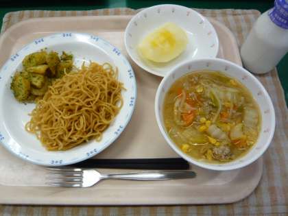 今日の給食は、「サッポロラーメン」です。野菜がたくさん入っている、栄養いっぱいのラーメンです。そこでクイズです。今日のラーメンには、何種類の野菜が入っているでしょうか?