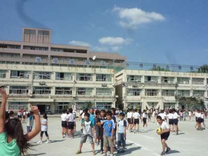 秋空の校庭で遊ぶ子どもたちはいたって元気です。