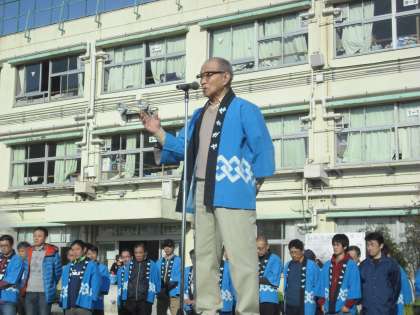 すばらしい晴天のもと、用賀小学校のもちつき大会が始まりました。はじめの会では副委員長の柳田様よりもちつきについてのお話をしていただきました。そして、1年生の代表がもちつきを楽しみしている気持ちを立派に述べました。