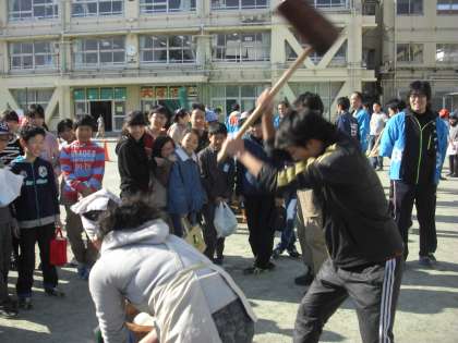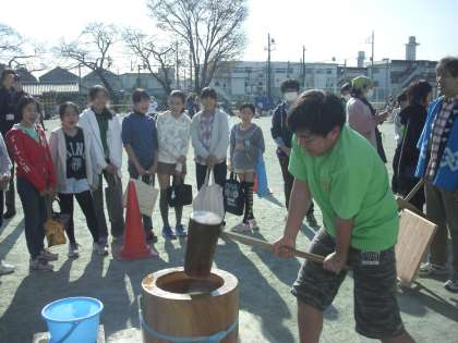 6年生は用賀小学校では最後のもちつき。6年生にもなると中には大人顔負けのパワーの持ち主も。担任の先生も子どもたちの前にするとやや張り切り気味の様子。先生と子どもたちで最後のもちつきを楽しみました。