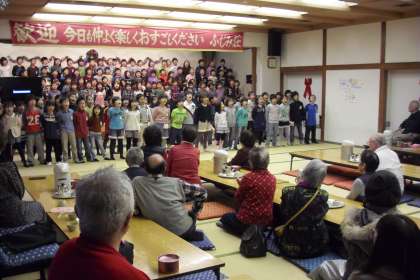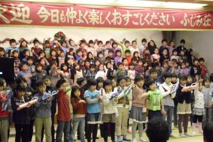 用賀小学校の近隣にある高齢者の休養施設「ふじみ荘」で2年生が「小さな音楽会」を開催しました。お元気な高齢者の集まる「ふじみ荘」の大広場で、元気いっぱいに、心をこめて「大空賛歌」「あえてよかった」「学校坂道」「たんぽぽ」「虹」の5曲を発表しました。生活科の町探検でお世話になった「ふじみ荘」へのお礼と合唱を通して高齢者の方々とかかわる価値ある貴重な体験をさせることを目的に、今年度から取り組みました。笑顔で鑑賞してくださる多くの高齢者の皆様と、心を込めて歌う2年生の元気な歌声は、世代を超えた人と人とのかかわりとつながりを感じ、和やかなひと時となりました。
