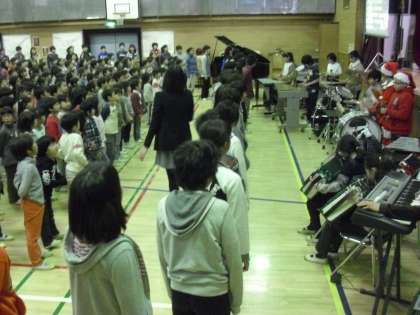 12/24 音楽集会 公開日 2013/12/24 更新日 2013/12/24 委員会・クラブ活動 今日の音楽集会は子どもたちが毎年楽しみにしているもみの木集会です。体育館の舞台には音楽委員会の子どもたちは飾り付けをした大きなツリーが置かれました。音楽委員会の子どもたちによる寸劇を見たり、音楽委員会の子どもたちの伴奏に合わせてみんなで歌を歌ったり、楽しく過ごしました。 2学期も今日を入れてあと2日。学校では子どもたちとしっかりと2学期のしめくくりをします。