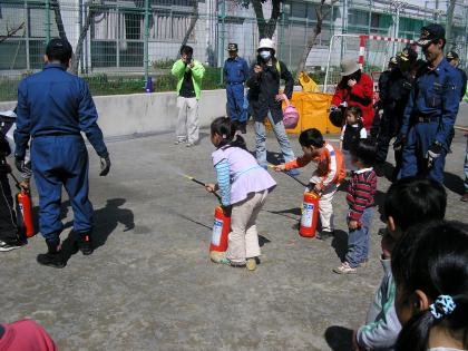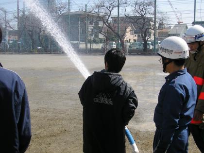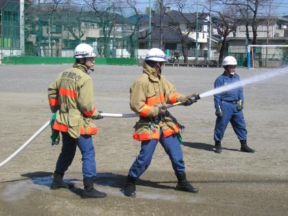 豚汁とアルファー米の昼食の後は、消防署の方からD級ポンプや消火器の使い方の説明と体験です。中学生がD級ポンプの筒先を持って、消火訓練です。ちびっ子も、消火器を使っての訓練をしました。