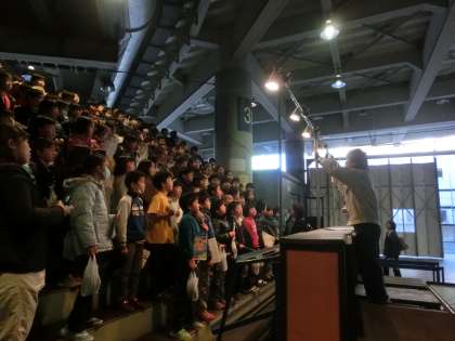 子供たちは、競りの様子や市場の働きについての説明を真剣に聞き、熱心にメモをとっていました。また、実際にフォークリフトやターレット(商品の運搬車)が動く様子を見たときには歓声が上がっていました。
