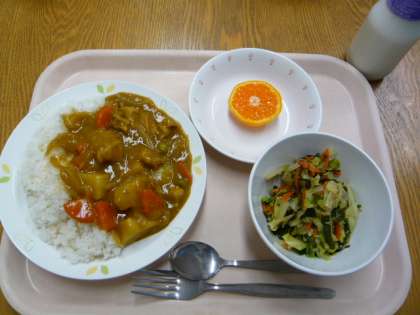 今日の給食には、たまねぎやにんじん、キャベツなど、たくさんの野菜が使われています。そこでクイズです。野菜は、1日にどれくらい食べるとよいでしょうか?