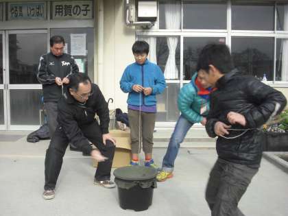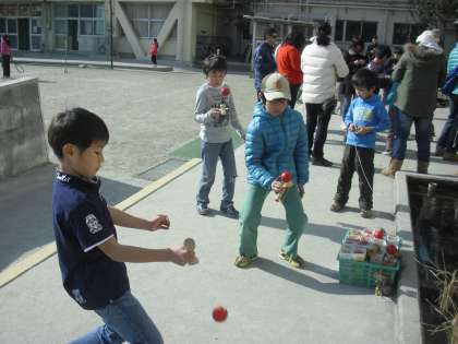 今日のふれあい広場は1年に1回の昔遊びです。校庭では竹とんぼに羽根つき、竹馬。日差しも出てきて、子供たちは元気に遊んでいました。犬走りではけん玉、めんこにこままわし。ベーゴマ遊びでは得意な男の子が他の子や大人にもやり方を教えてくれて、遊びの輪がどんどん広がりました。