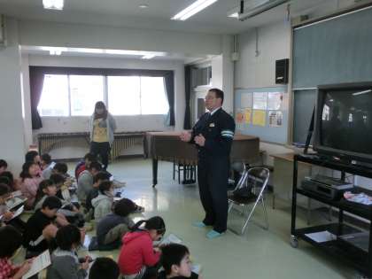 本日社会科の学習で、玉川警察署の馬事公園前駐在所と交通課の方に交通安全についてのお話をうかがいました。