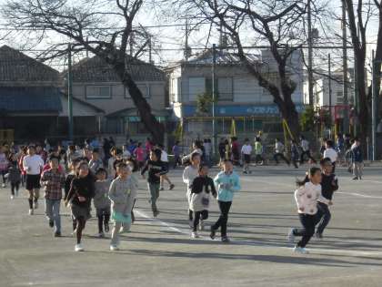 用賀小学校では子供たちは毎朝登校すると校庭でランニングをしています。これを学校では「朝ラン」と呼んでいます。高学年の子どもは1周200mの外側のコースを、低学年の子どもはトラックをそれぞれ走っています。特に高学年の子供たちは寒いこの時期だけでなく、年間を通して走っています。