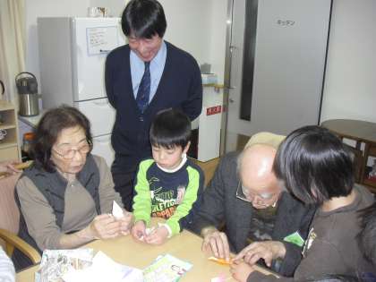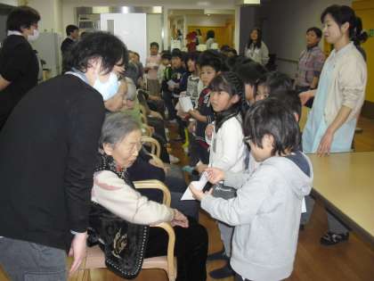 おじいちゃんやおばあちゃんと暮らしている子はとても少なく、皆お年寄りとどう接したらよいか緊張気味でした。しかし、部屋に入ると、おじいちゃんやおばあちゃんが笑顔で迎えてくださり、緊張も徐々に和らいでいきました。