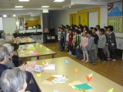 手作りのカードを手渡して自己紹介したり、一緒に折り紙で鶴を折ったり、歌を聞いていただいたりと、あっという間のふれあいの時間でした。