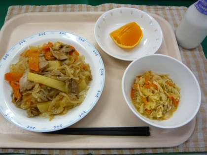 今日は、学校給食週間2日目です。今日の献立は、5年1組の給食委員さんが中心になって考えてくれた「体ぽかぽかあったかメニュー」です。