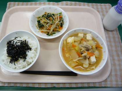 1/29 本日の給食 公開日 2014/01/30 更新日 2014/01/30 給食 〜今日の献立〜 ごはん 韓国風ふりかけ 牛乳 鶏肉と大根のキムチ鍋風 ほうれん草のナムル 〜給食メモ〜 今日は、学校給食週間4日目です。今日の献立は、6年1組の給食委員さんが中心になって考えてくれた「野菜たっぷりメニュー」です。 6年1組給食委員さんからのメッセージ 野菜は、体の調子を整えてくれる働きがあります。野菜をたくさん食べて元気に過ごして下さい。 食材がとれたところ・・・ 閉じる 米…埼玉県 鶏肉…岩手県、宮崎県 にんにく…青森県 だいこん…神奈川県 にんじん…千葉県 しめじ…長野県 はくさい…群馬県 長ねぎ…千葉県 もやし…群馬県 ほうれんそう…千葉県