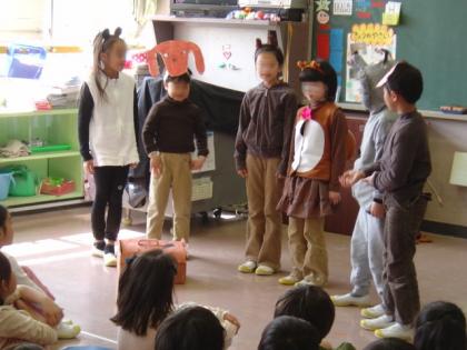 「私たちは、みんなでげきの話を考えてれんしゅうをしました。みんながんばってれんしゅうをしています。おもしろいげきがいっぱいあります。2年4組のげきをぜひ見てください」という招待状をいただきました。学年末に、今まで学習した「登場人物になって話そう」や、作文の勉強のまとめとして、自分たちで台本から、衣装まで考えての「げきランド」開催です。一人一人の目がキラキラ輝いていたのを、たくさんのお母さん、お父さんに見ていただいて嬉しそう!