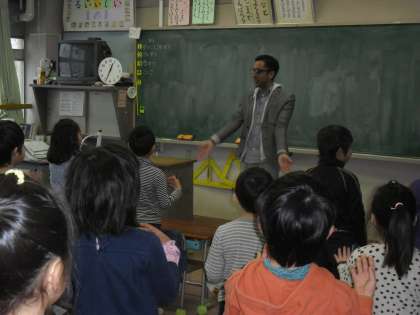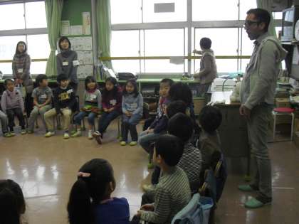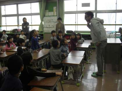 1年生の教室では初めての英語活動。ALTが子どもたちの関心を上手に引き出し、子どもたちは歌やゲームを交えて楽しく学習していました。My name is ○○.としっかり自己紹介できました。