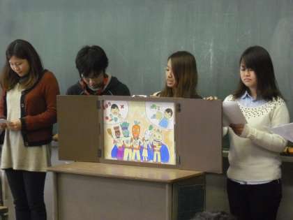 テーマは野菜が食べられるようになるために。1年生の時子どもたちはベジレンジャーに野菜を食べる大切さを教えてもらいました。今日は野菜を実際に色別に仕分けることで栄養について考えました。また、農大の学生による紙芝居にも夢中になっていました。