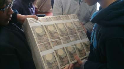税理士の方をお招きして租税教室を行いました。税金は、何のためにあるのか、どのように使われているのかなど、非常に役立つことをクイズを交えながら教えていただきました。また、授業の中で1億円を見せていただきました。なんと10kgもありました。子供たちは、重さにびっくりしていました。