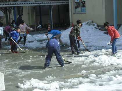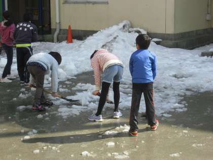 先日の大雪が今朝の冷え込みで氷ってしまい、校庭も昇降口前もたいへんなことになってしまいました。