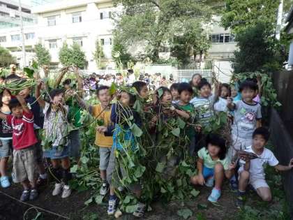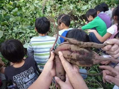 大きなサツマイモの蔓を学級のみんなで持ってみましたが、その長くてしっかりしていることにまたびっくり・・・!