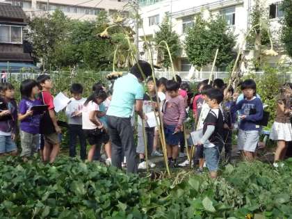 サツマイモ畑のはじに3年生がヒマワリを植えていましたが、立派な種がなったので一生懸命観察をしていました。一つの畑でたくさんの学習ができることに感謝です。